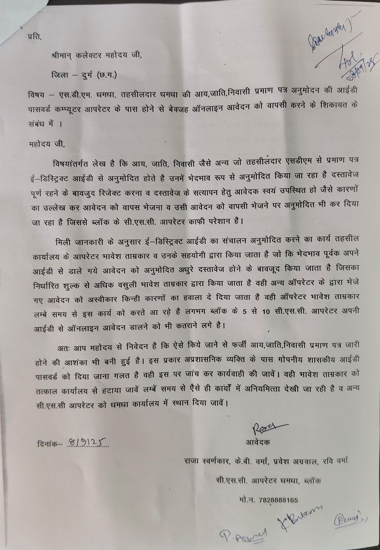 धमधा तहसील में ऑनलाइन आय जाति निवासी बनाने मे हो रही है अनियमितता व अवैध वसूली- ग्रामीणों के साथ- साथ सीएससी ऑपरेटर है काफी परेशान- अधिकारियों की प्रशासनिक आईडी...