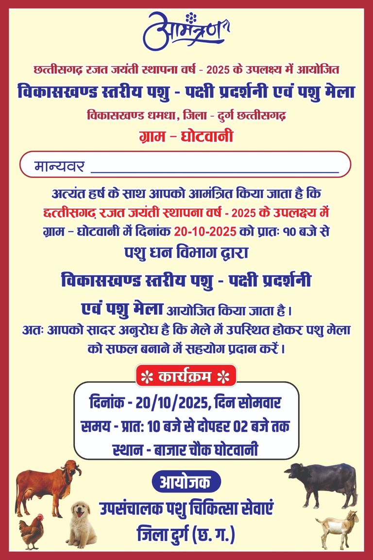 20 अक्टूबर को विकासखण्ड स्तरीय पशु पक्षी प्रदर्शनी व पशु मेला होगा सम्पन्न हेमंत उमरे CG सच तक धमधा/ उपसंचालक पशु सेवाएं जिला दुर्ग व पशु औषधालय घोटवानी के तत्व...
