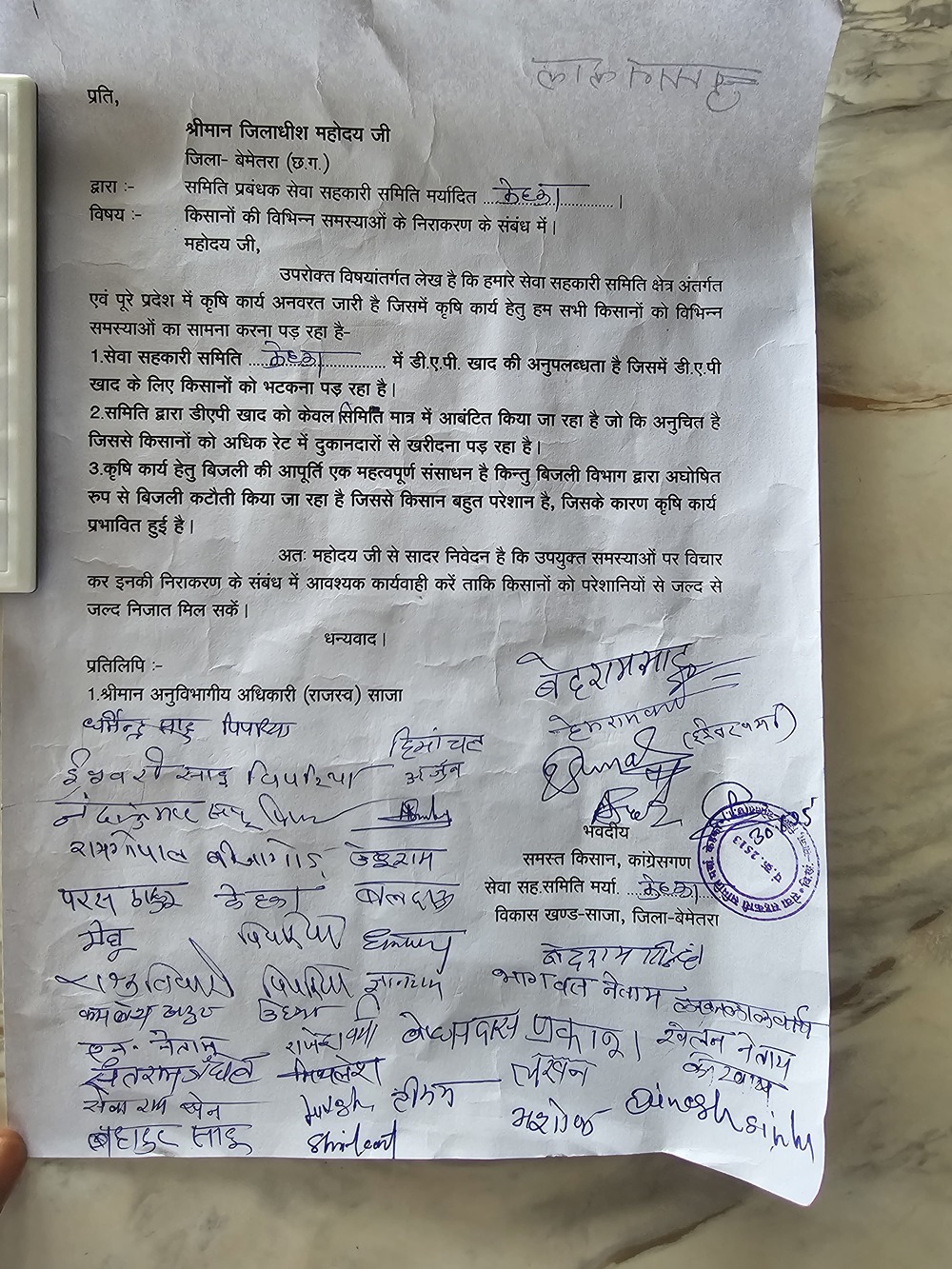 बेमेतरा कलेक्टर के नाम ज्ञापन सौंप गया है।